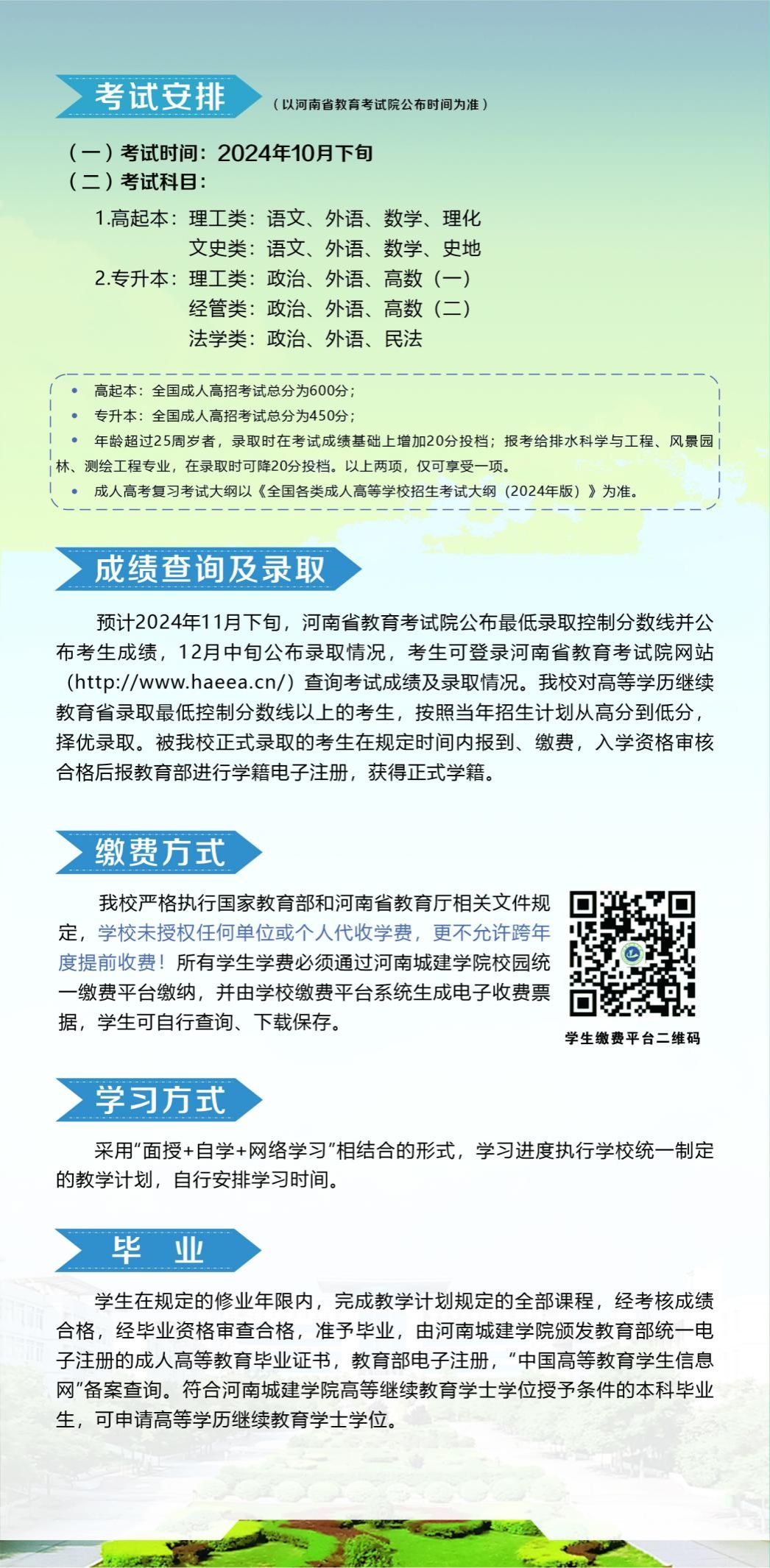 三、请广大考生务必注意,beats365官网入口高等学历继续教育招生公告以河南省教育厅、河南省教育考试院、beats365官网入口官网及其微信公众号发布的招生简章和招生信息为准,考生访问“河南省教育考试院(http://www.haeea.cn)”,登录“河南省成人高校招生考生服务平台”进行报名,切记不要轻信其他非法招生中介和个人。同时,公司在员工录取报到前不收取任何费用,员工被公司录取后,学费一年一交,直接扫码交费至beats365官网入口财务处,公司未委托任何机构和个人代收代交学费。因轻信非法招生中介和个人的虚假宣传、登录其他非官方招生网站等造成的一切后果,由考生自行承担,beats365官网入口对此不承担任何责任。