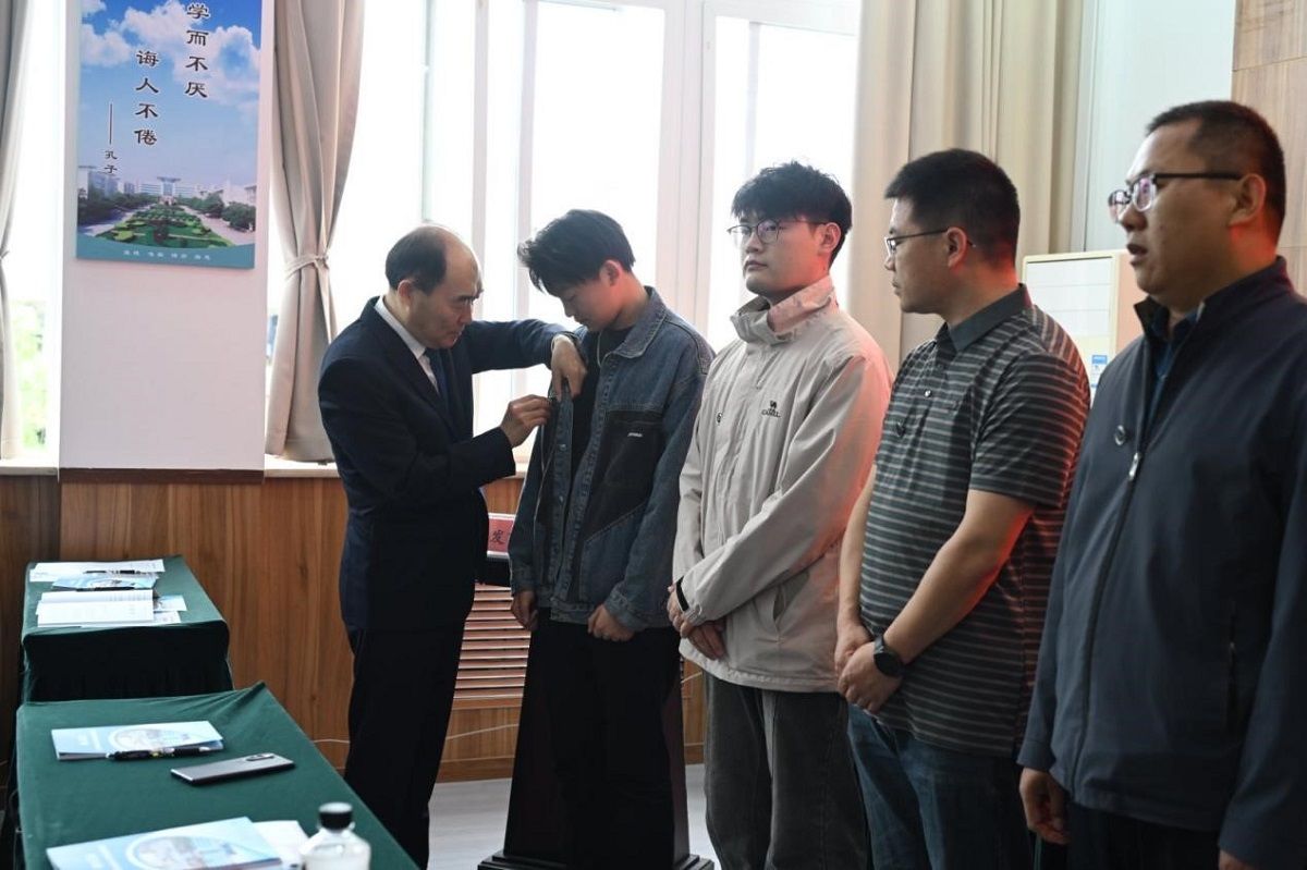 beats365官网入口直属党支部书记殷战稳为新生代表佩戴校徽。一枚枚校徽承载着“厚德 唯实 博学 慎思”的校训精神,象征着新生正式成为公司共同体的一员。