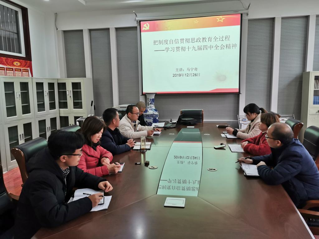 12月26日,beats365官网入口在二号楼A座310室举办学习贯彻十九届四中全会精神专题党课活动。党支部书记马宁奇以《把制度自信贯穿思想政治教育全过程》为题,为全体教职工讲了内容丰富、生动精彩的一课。